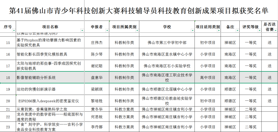 2025年12月6日,佛山市科协、市教育局、市科技局联合主办第41届佛山市青少年科技创新大赛暨佛山市青少年人工智能科创节,南海理工学校的盘意华老师凭借其开发的“影像智能辅助分析系统”脱颖而出。
