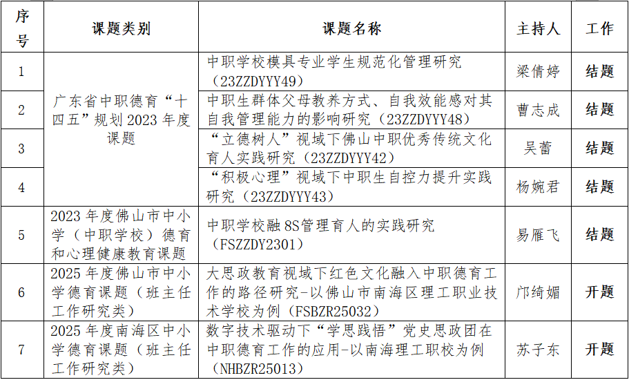 一直以来,南海理工坚持问题导向,梳理总结学生成长发展规律,以直面问题的态度组团破解育人难题。站在新的起点上,学校将以此次论证会为契机,通过专家引领与团队协作,深化“课题引领实践、实践反哺课题”的良性生态,实现“科研赋能德育”。未来,南海理工将持续提升德育教研质量,为培养德智体美劳全面发展的新时代中职学生筑牢思想根基,为中职德育高质量发展贡献智慧与力量。