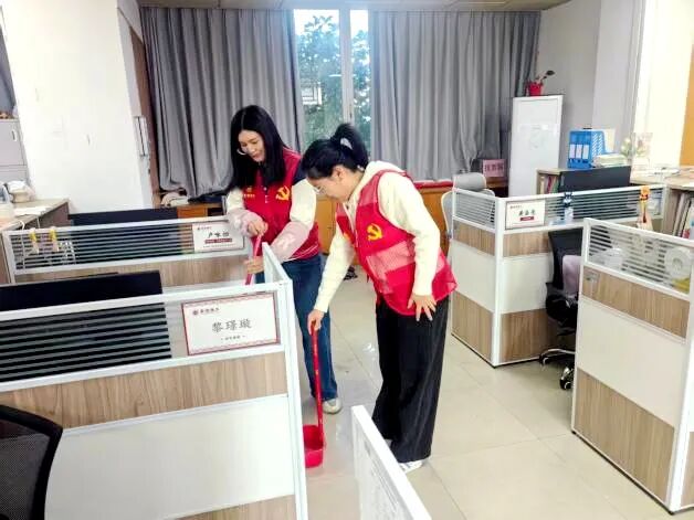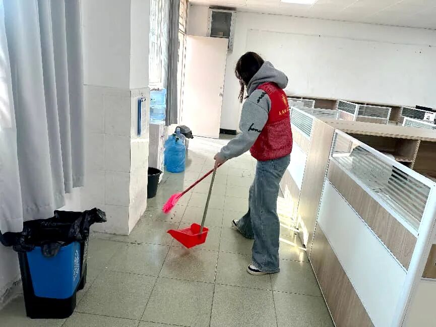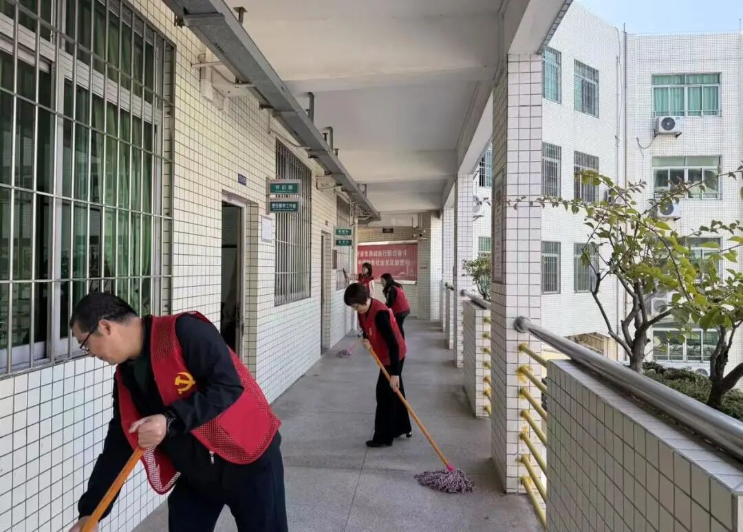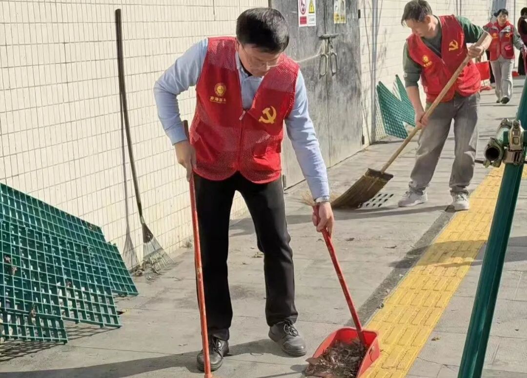 活动中,党员志愿者们身穿红马甲,手持扫帚、抹布等清洁工具,精神饱满地投入到劳动中。他们分工明确,协同合作,重点对办公室、走廊、校园主干道两侧及绿化带内的落叶杂物、卫生死角进行了全面细致的清理。大家干劲十足,不怕脏、不怕累,现场呈现出一派热火朝天的劳动景象。经过数小时的辛勤劳动,校园环境变得更加干净、整洁、有序。